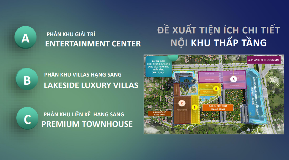 - Phân khu thấp tầng bao gồm: 54 Biệt thự, 110 Shophouse và 501 Liền kề