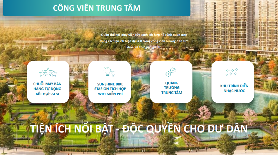 - Quần thể hai công viên cây xanh kết hợp hồ cảnh quan ứng dụng các tiện ích hiện đại 4.0 trong công viên hướng đến sức khỏe và thư giãn giải trí cao độc quyền cho cư dân như