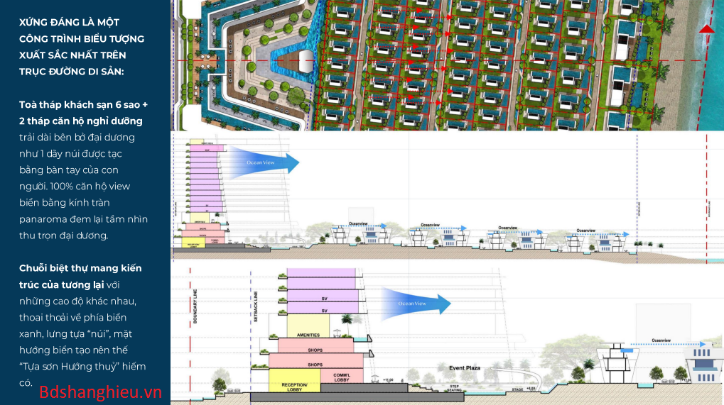 - Quy Mô Dự Án: 488 căn khách sạn 5 sao, 739 căn hộ nghỉ dưỡng kết hợp thương mại dịch vụ và văn phòng, 141 lô Villas hướng biển trong đó có 9 căn Super Vip