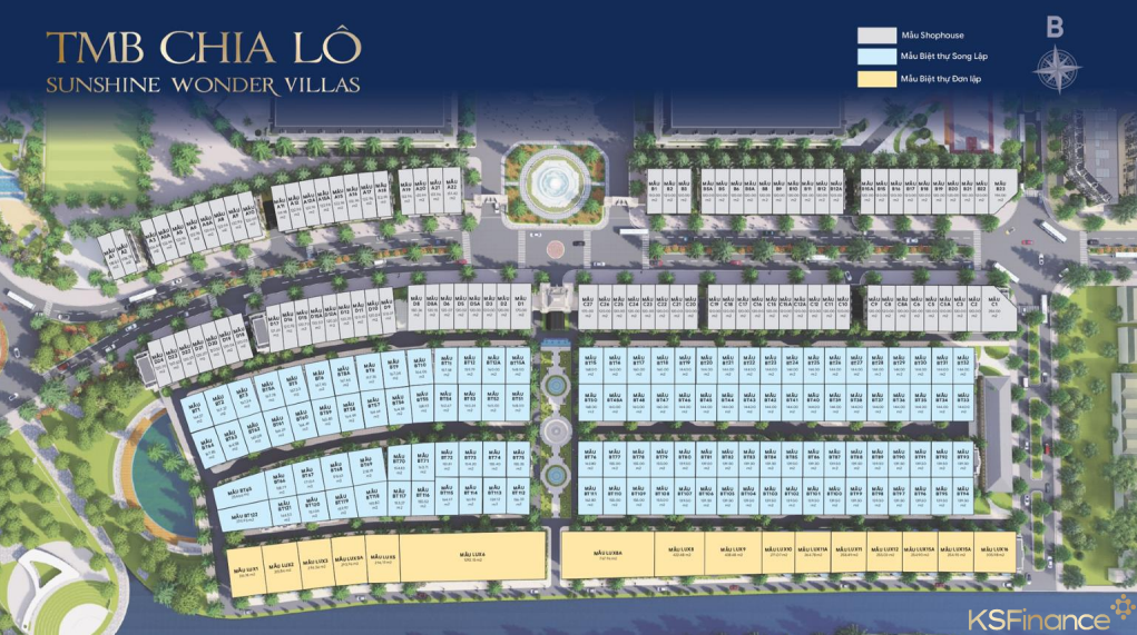 Khu đô thị được quy hoạch thành nhiều phân khu với chức năng khác nhau bao gồm Biệt thự đơn lập, biệt thự liền kề và shophouse